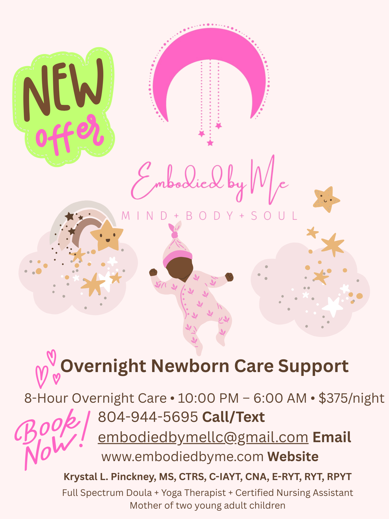Embodied by Me offers non-medical doula support designed to nurture families through pregnancy, birth, and postpartum recovery. Services are rooted in respect, collaboration, and trauma-informed care, providing emotional reassurance, education, and hands-on support tailored to your needs. Flexible payment plans are available to support access to care.